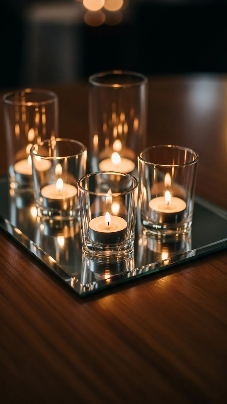 Place candles on a mirrored tray in the center. The reflection doubles candlelight and makes the table feel more layered. Mirrors also protect your table from wax. This simple trick amplifies ambiance without extra decor.